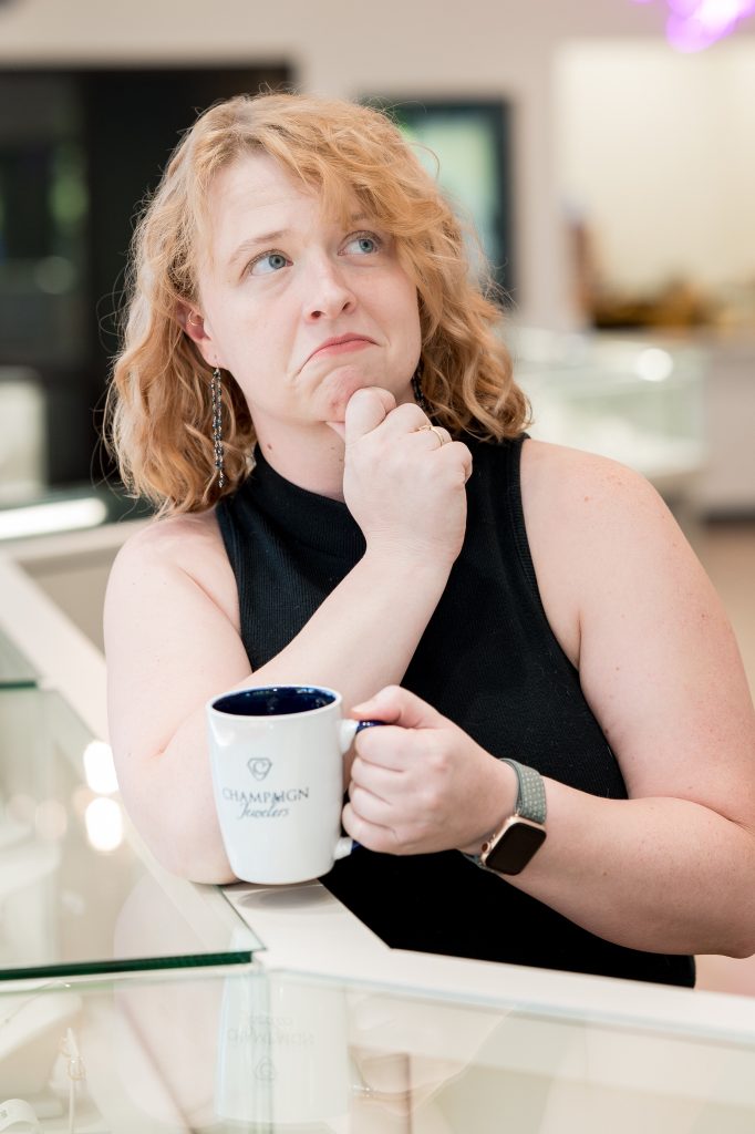 Tessa works mostly behind the scenes at Champaign Jewelers, helping keep the store’s inventory organized and day-to-day details running smoothly. She’s the go-to person for sorting out puzzles, improving systems, and offering quiet support wherever it’s needed.